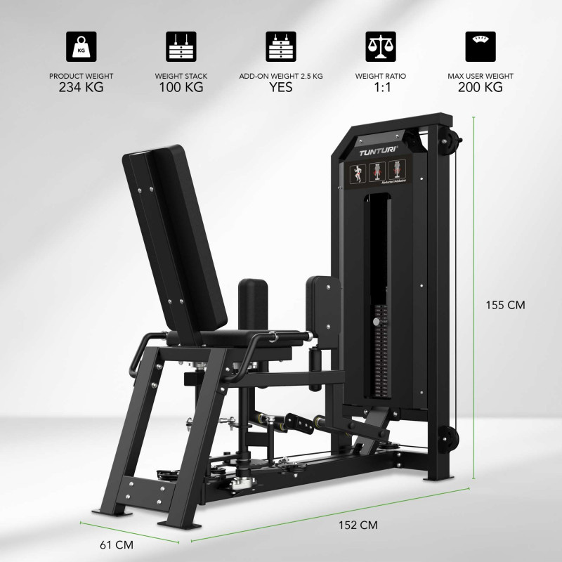 A Tunturi Platinum dual Abductor / Adductor gépet úgy tervezték, hogy a comb belső és külső izmait is erősítse. Ez a sokoldalú állomás sima és kontrollált mozgást kínál mind a combtávolító, mind a combközelítő izmok hatékony edzéséhez. 100 kg-os súlykészlettel, erős 2,5 mm-es acélvázzal és sima ellenállás-átvitellel ez az eszköz nélkülözhetetlen bármilyen professzionális edzéskörnyezetben. Kompakt és ergonomikus kialakításának köszönhetően ez a professzionális gép tökéletesen illeszkedik bármilyen edzéskörnyezetbe.