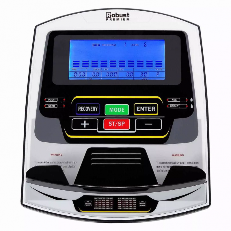 - A Robust Premium Montana fronthatásos elliptikus tréner kapaszkodó karokba épített kézi pulzus mérővel és a kijelzőbe beépített telemetriás vevővel is rendelkezik. (az öv nem tartozéka a gépnek)