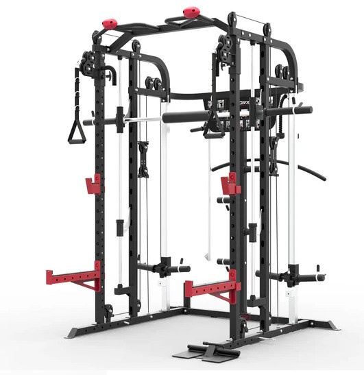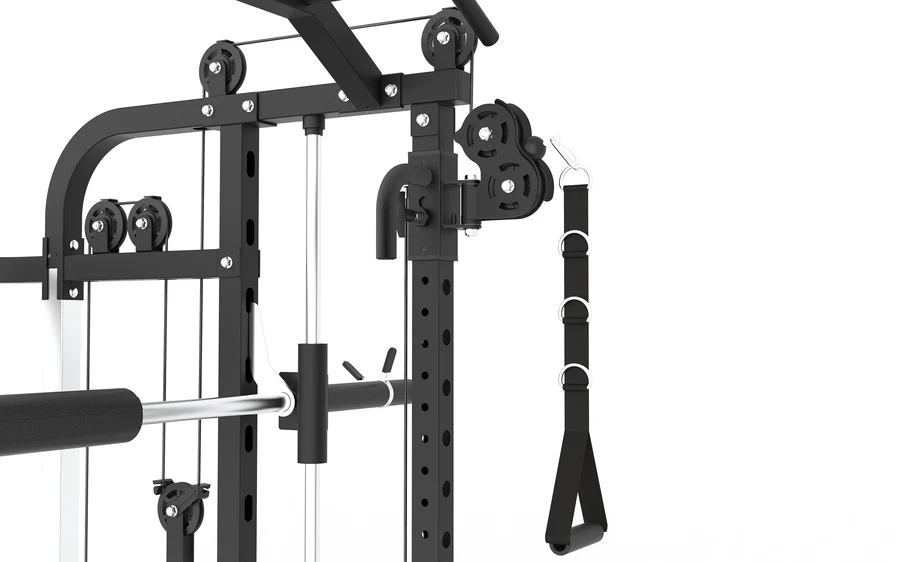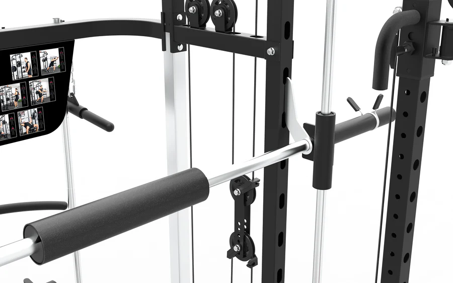 - 1 db guggoló rúd, 2 J-horog, 2 biztonsági feszítőkar, súlyzótartó, többfogású állhúzó rúd, 4 csap az ellenállás-szalaghoz, 8 súlytárcsa tartó 50 mm és 25 mm átmérőjű tárcsákhoz, 12 db olimpiai rugós rögzítő 49 mm és 4 db rögzítő 25 mm. Tartozékok: bokaszíj, tricepszkötél, lánc, 2 állítható Y-fogantyú, hosszított húzórúd és egy rövid egyenes rúd tartozék A rúd 1743 mm, lieáris csúszású csapágyakkal, 2 biztonsági rendszerrel horoggal a súlyzó leesésének megakadályozására, függőlegesen 16 szinten állítható (455 - 1805 mm) távolság 90 mm. Súlytárcsa tartó átmérője alkalmas az 50 mm-es és a 25 mm-es súlytárcsákhoz.